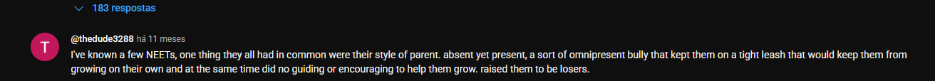 Estava assistindo um vídeo sobre NEETS e vi esse comentário, diriam que é similar ao tipo de criação que tiveram? Da minha parte sim, meus pais nunca me ensinaram porra nenhuma, nunca cultivaram um gosto meu, nunca me incentivaram pra nada. Me jogaram pro mundo e terceirizaram a responsabilidade pra escola… como se lá fosse lugar pra isso. Eu tento não ter ressentimento mas sinceramente acho muito difícil, minha mãe nunca demonstrou afeto comigo e foi embora assim que fiz 17 anos, ou seja, só confirmou o quê eu suspeitava: ela NUNCA me quis. Minha vida foi um acidente de duas pessoas que já tinham idade suficiente pra saber o que estavam fazendo (27 e 24), então é surpresa pra alguém que eu seja um perdido na vida? Acho que no fundo minha alma clama pra voltar à inexistência — lugar de onde eu nunca deveria ter saído —, o que mais explica eu não ter gosto por nada na vida? Não tenho gosto por música, filmes, séries, hobbies, esportes, nem de videogame eu gosto tanto assim. A única coisa que gosto de verdade é de dormir, porque é o único meio pra escapar, mesmo que temporaneamente, da minha existência.